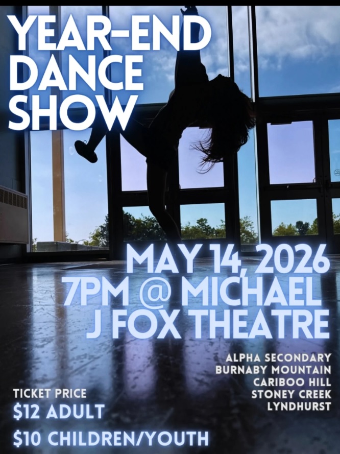 Year End Dance Show presented by Alpha Secondary, Burnaby Mountain Secondary, Cariboo Hill Secondary, Stoney Creek Elementary & Lyndhurst Elementary + Add to Google Calendar + iCal / Outlook export Date May 14 2026 Time 7:00 PM Category District Public Organizer Burnaby Mountain Secondary School Phone (604) 296-6870 Website https://mountain.burnabyschools.ca/ Other Organizers Alpha Secondary School Phone (604) 296-6865 Email alpha.info@burnabyschools.ca Website https://alpha.burnabyschools.ca/ Cariboo Hill Secondary School Phone (604) 296-6890 Email Cariboo.Info@burnabyschools.ca Website https://cariboohill.burnabyschools.ca/ Next Event Liu Ruoxi Vocal Art Academy presents Songs of Ruoxi – Ruoxi Liu and her Students’ Concert Date May 15 2026 Time 7:00 PM Share this event