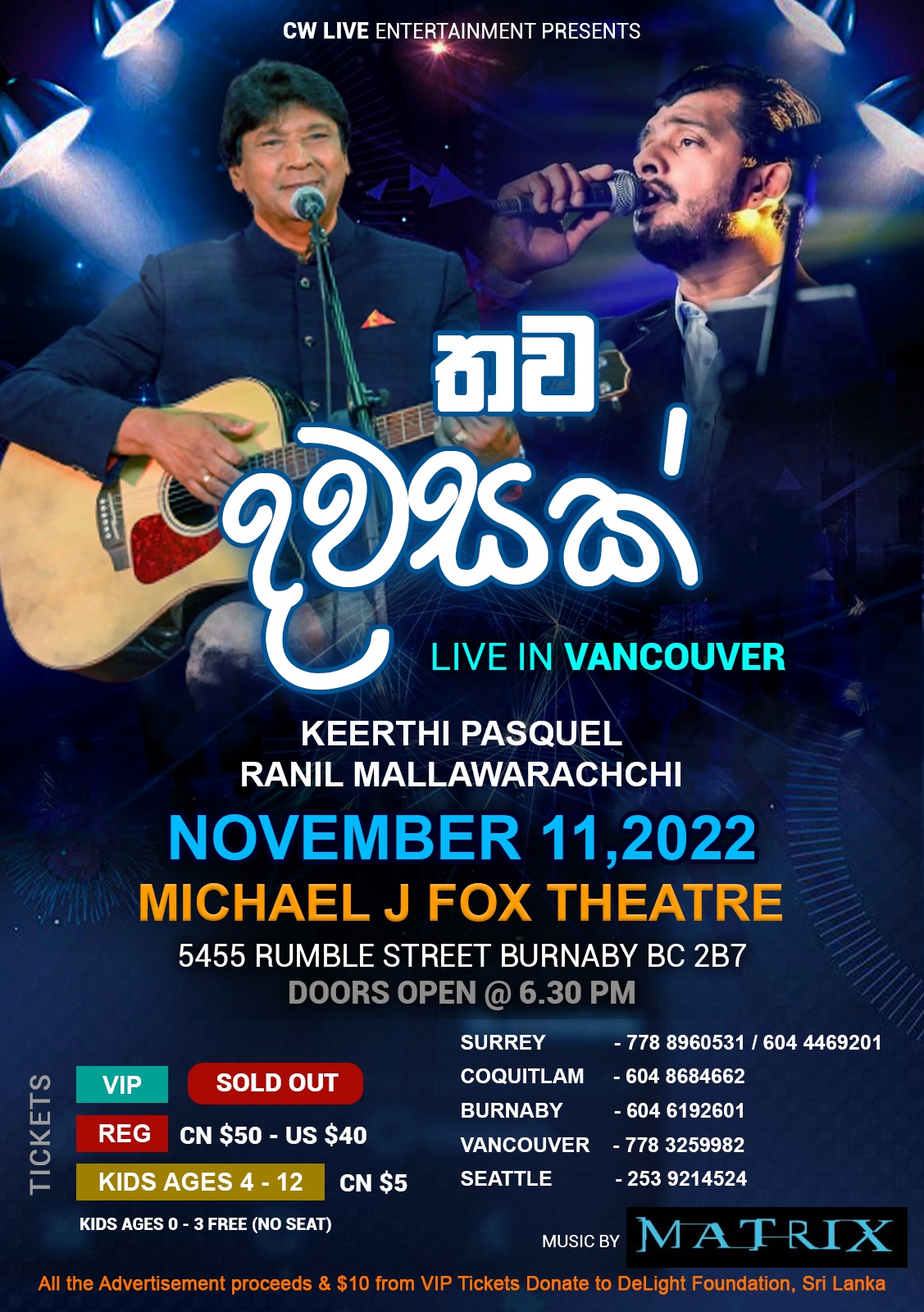 CW Live Entertainment presents තව දවසක් – Keerthi Pasquel and Ranil Mallawarachchi: Live in Vancouver + Add to Google Calendar + iCal / Outlook export Date Nov 11 2022 Expired! Time 7:00 PM Category Public Organizer CW Live Entertainment Next Event Global Dance Services presents Synergy Dance Competition – Burnaby 2026 Date Apr 20 - 26 2026 Time All Day Share this event