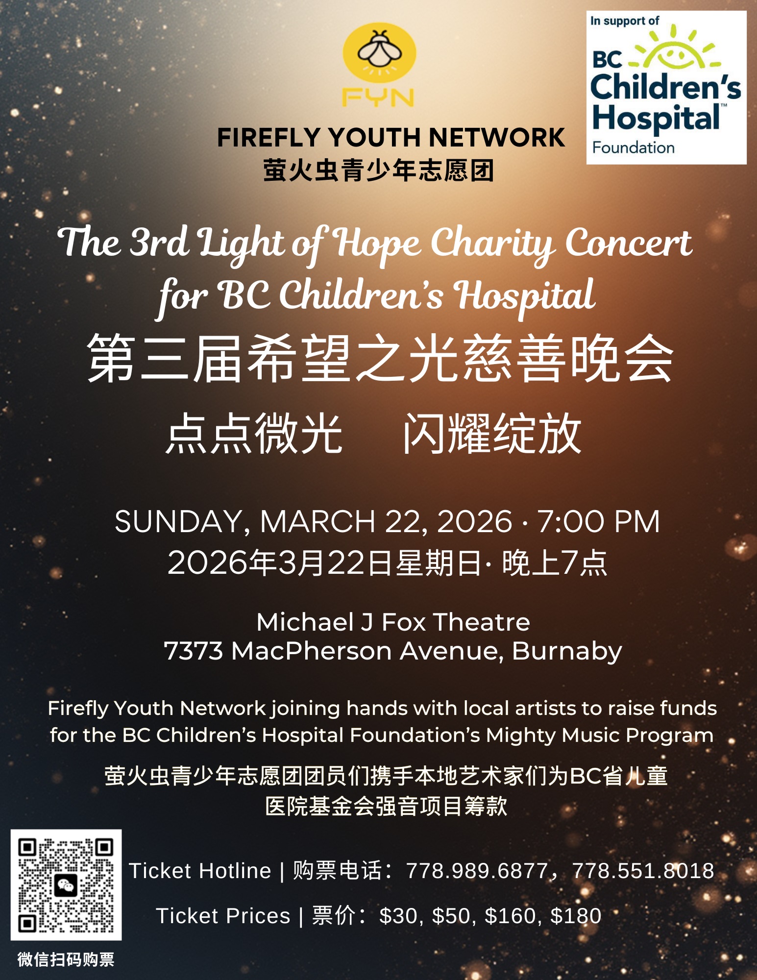 Firefly Youth Network presents 第三届希望之光慈善晚會 The Third Light of Hope Charity Concert: 萤火虫青少年志愿团为卑诗省儿童医院筹款晚会 Firefly Youth Network Fundraiser for BC Children’s Hospital