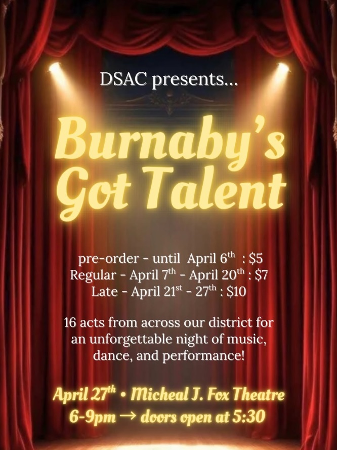 Burnaby School District’s DSAC presents Burnaby’s Got Talent 2026 Doors open at 5:30PM + Add to Google Calendar + iCal / Outlook export Date Apr 27 2026 Time 6:00 PM Category District Public Organizer Burnaby School District Phone (604) 296-6900 Website https://burnabyschools.ca/ Next Event SheepCo Entertainment Представляет presents КАТЕРИНА ГОРДЕЕВА В ВАНКУВЕРЕ – стендап тур “ЭТО ОНА” in Vancouver Katerina Gordeeva Concert in Vancouver Date Apr 28 2026 Time 8:00 PM Share this event