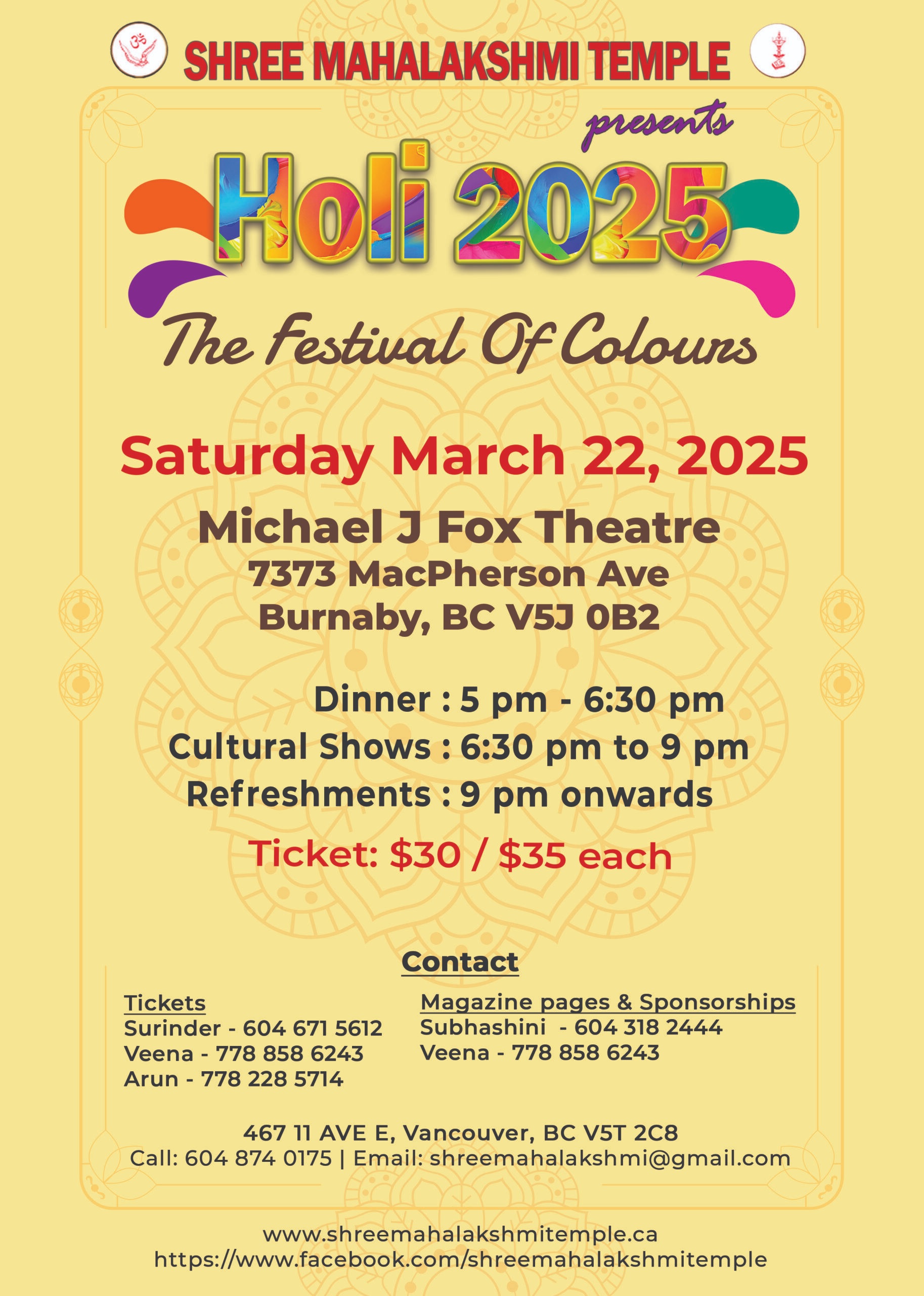 Shree Mahalakshmi Temple presents 2025 Holi Celebration Dinner 5:00PM-6:30PMCultural Shows 6:30PM-9:00PMRefreshments 9:00PM onwards. + Add to Google Calendar + iCal / Outlook export Date Mar 22 2025 Expired! Time 6:30 PM Category Public Organizer Shree Mahalakshmi Temple Phone (604) 874-0175 Website https://www.facebook.com/shreemahalakshmitemple/ Next Event Closed for Winter Break Date Dec 22 2025 - Jan 04 2026 Time All Day Share this event