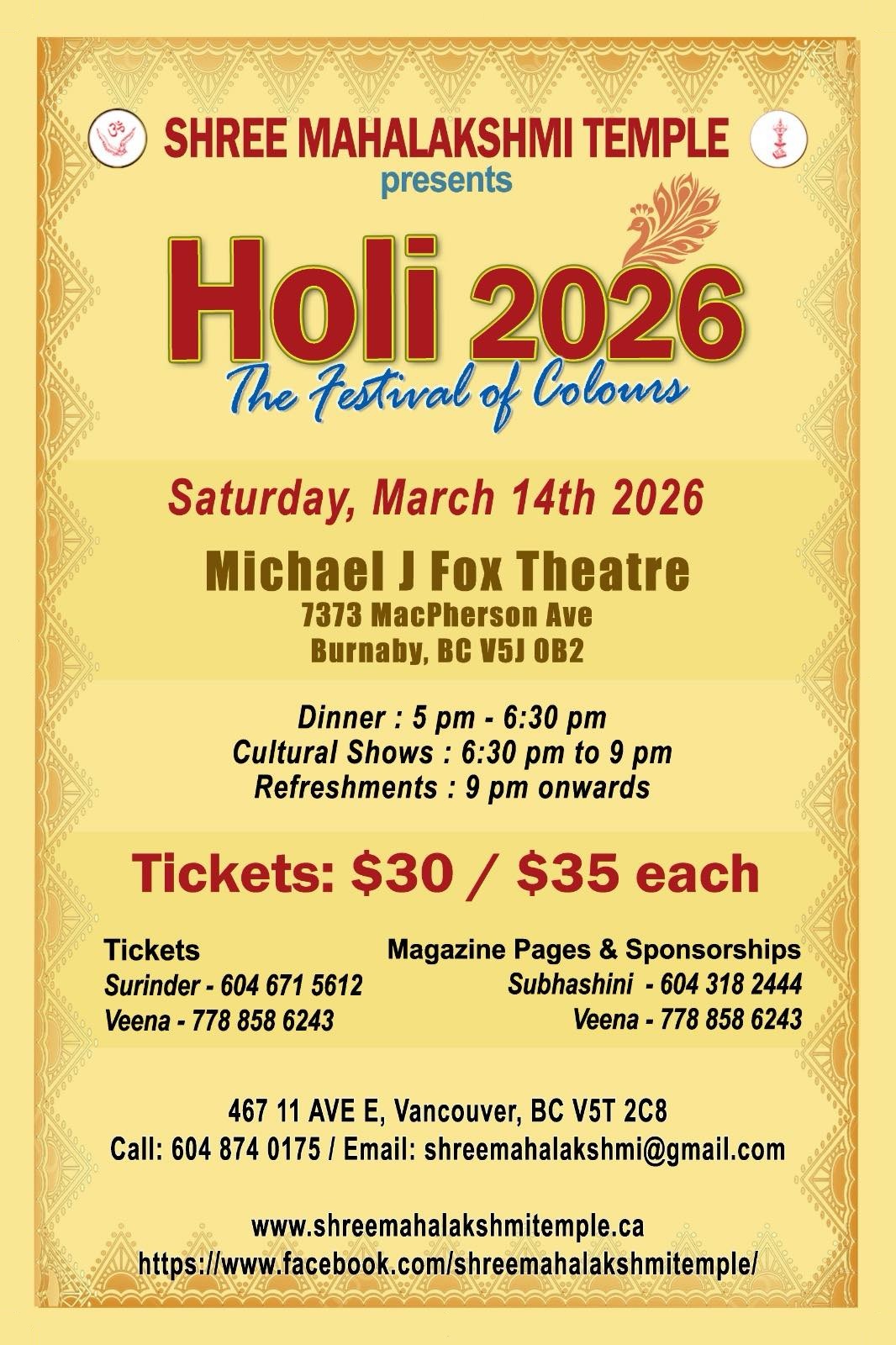 Shree Mahalakshmi Temple presents 2026 Holi Celebration Dinner 5:00PM-6:30PMCultural Shows 6:30PM-9:00PMRefreshments 9:00PM onwards. + Add to Google Calendar + iCal / Outlook export Date Mar 14 2026 Time 6:30 PM Category Public Organizer Shree Mahalakshmi Temple Phone (604) 874-0175 Website https://www.facebook.com/shreemahalakshmitemple/ Next Event Maintenance Date Mar 15 2026 Time 8:30 AM - 4:30 PM Share this event