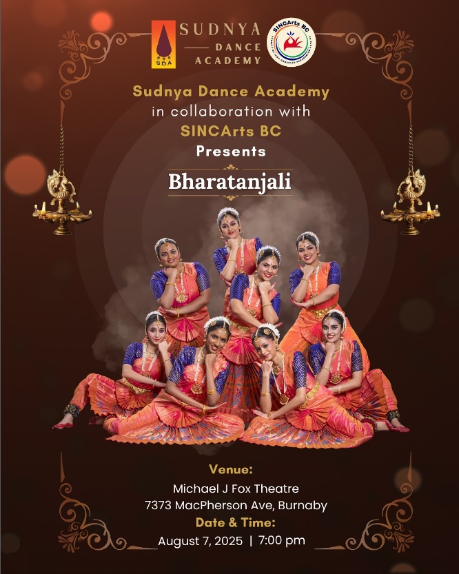 SINCArtsBC presents Bharatanjali 2025 + Add to Google Calendar + iCal / Outlook export Date Aug 07 2025 Expired! Time 6:00 PM Category Private Organizer SINCArtsBC Email SINCArtsBC@gmail.com Website https://www.sincartsbc.com/home Next Event DARK Date Feb 02 - 05 2026 Time All Day Share this event