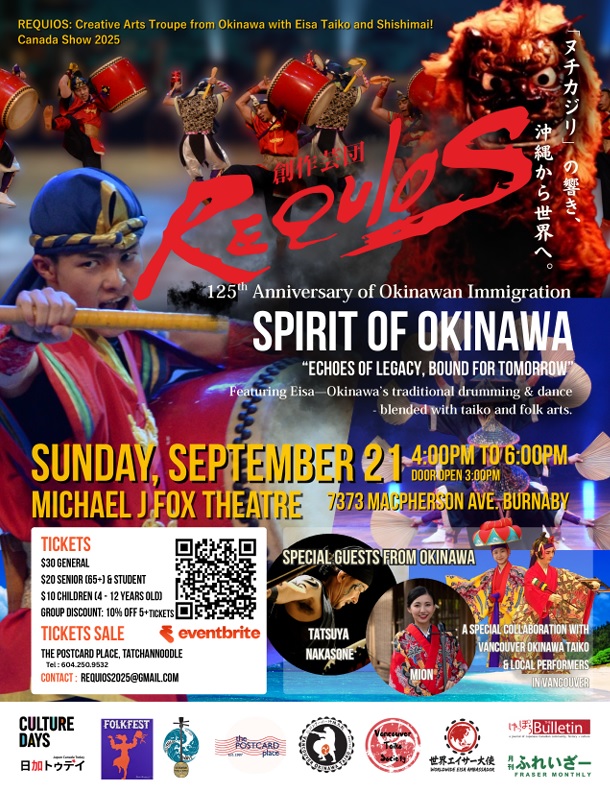 Join us for a spectacular cultural celebration marking the 125th anniversary of Okinawan immigration to Canada! This special event features REQUIOS, the acclaimed creative performing arts troupe from Okinawa, known for their dynamic and innovative stage interpretations of traditional Okinawan arts, including Eisa Taiko (drum dancing)