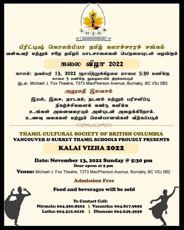 Kalai Vizha 2022 தமிழ் பாடசாலைகளின் கலை விழா [Tamil Schools Kalai Vizha] presented by the Thamil Cultural Society of BC + Add to Google Calendar + iCal / Outlook export Date Nov 13 2022 Expired! Time 5:30 PM Category Public Organizer Thamil Cultural Society of BC பிரிட்டிஷ் கொலம்பியா தமிழ் கலாச்சாரச் சங்கம் Phone (604) 378-5570 Website https://tcsbc.com/ Next Event Global Dance Services presents Synergy Dance Competition – Burnaby 2026 Date Apr 20 - 26 2026 Time All Day Share this event